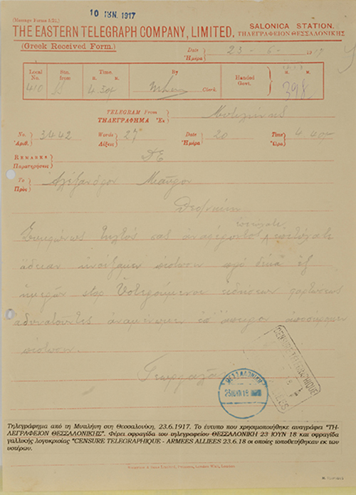 Τηλεγράφημα απο Μυτιλήνη στη ΘεσσαλονίκηΧάρτης Τζ. Αριστάρχη